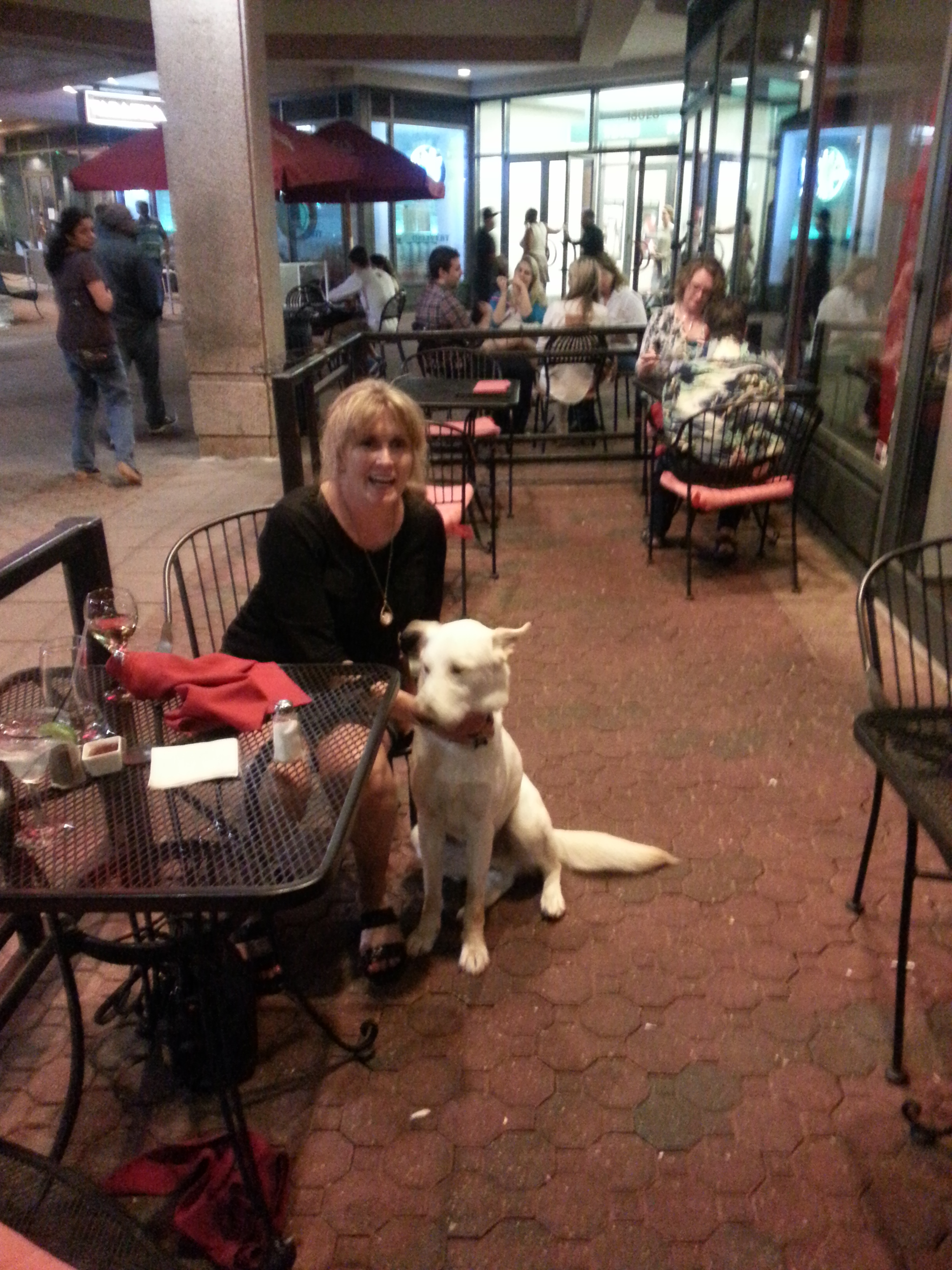 Honorarium: Small spaces and good food smells made me wiggy but I got lots of attention from everyone around me. The water was a nice touch. Next time we go I’m insisting on sitting outside of the railing where most of the interesting people are. Especially the ones with kids. I like them the best.